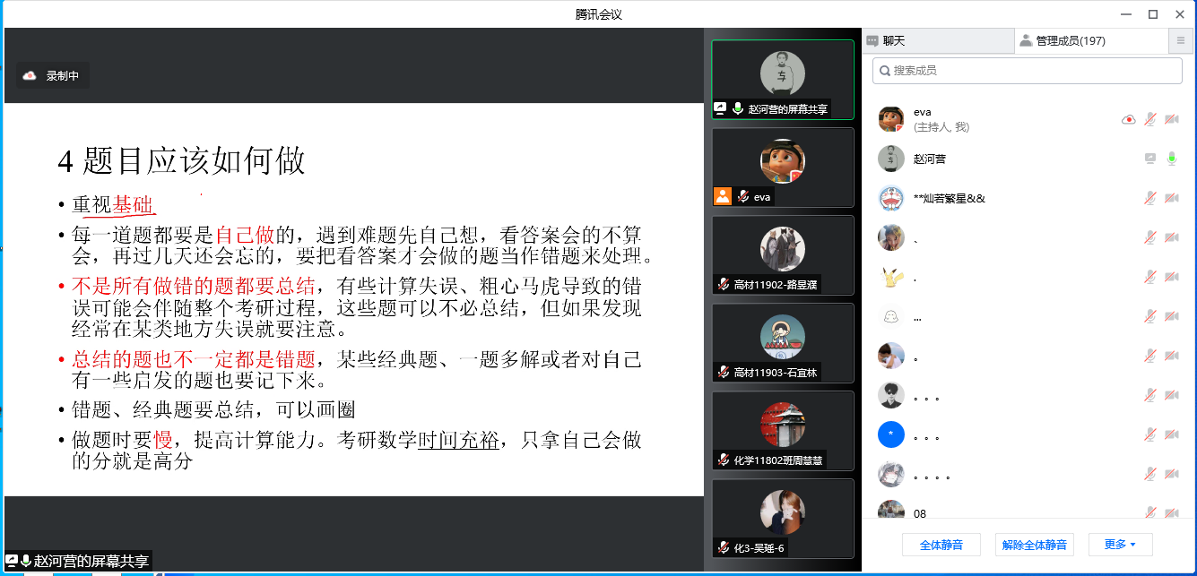 随后,成功录取湖南大学的周慧慧同学分别从自律、效率、心态等方面给大家传授了她的考研攻略。紧接着,赵河营与同学们交流考研数学的复习经验,他反复强调数学基础的重要性。张静同学着重分享了考研英语的学习经验,同时她还送给同学们一句话“求其上,得其中;求其中,得其下”,鼓励同学们要勇敢追梦,切不可定过低目标。最后,解妍同学讲述了学科教学专业课的复习经验,为数学不好的同学提供新的报考思路。