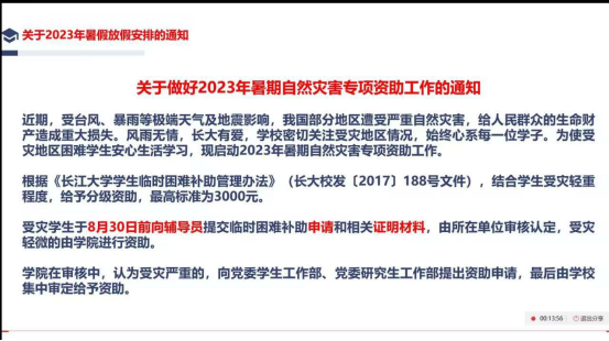 落实2023年暑期自然灾害专项资助工作,广泛宣传、加强精准资助,为受灾学生提供临时困难补助。