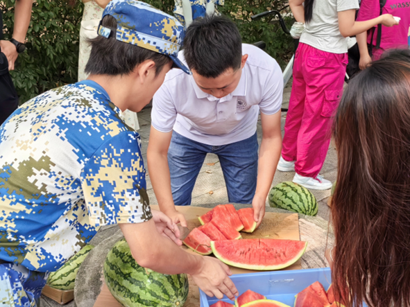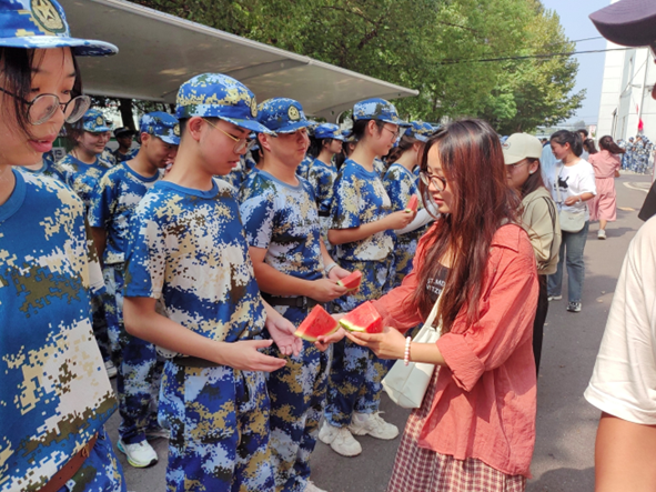 学生会和青支队的成员,为2024级参加军训的学生及教官送上了清凉解暑的饮品和瓜果。