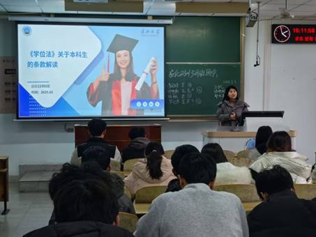 专业实际,详细说明了学分要求、课程成绩标准、毕业论文规范等具体内容,让同学们清楚认识到获得学位所需达到的学业水平。针对学位授予程序,班主任以时间线为轴,介绍了从申请到审核再到最终授予学位的各个环节,帮助同学们了解学位申请流程。同学们围绕学习心得和应用实践展开热烈讨论,进一步增强了法律意识和责任意识。