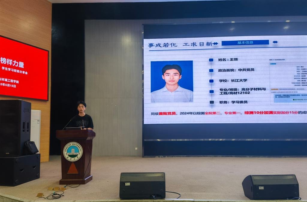 辅导员蔡略主持分享会,优秀学生代表王领、吴雪梅、陆栩洋、黄远依次上台,分享他们的学习心得与成长故事。
