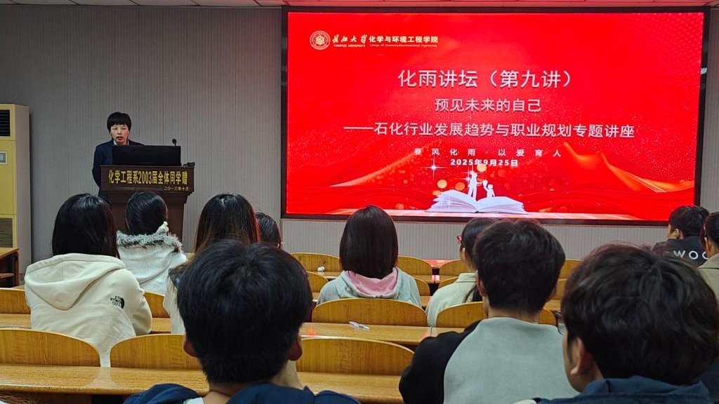 在 14 教北 201 教室举办“化雨讲坛”第九讲,东明石化人事经理魏玉婷受邀带来“预见未来的自己——石化行业趋势与职业规划”专题讲座。22级、23级、24级部分学生积极参加。