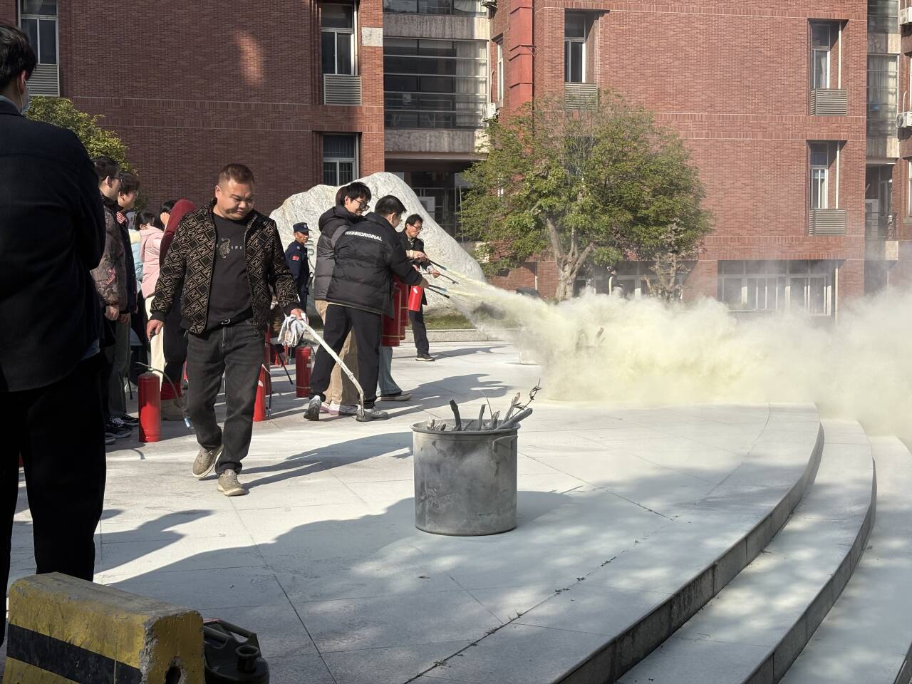 保卫处万杨科长聚焦消防器材实操技能开展系统化教学。在14教室南广场的实操场地,保卫处老师详细演示了干粉灭火器、消防栓的核心构造与标准使用流程,逐一拆解“提瓶身、拔保险、握喷管、压手柄”的规范动作要领。针对研究生科研场景中可能遇到的电器火灾、化学试剂火灾等不同类型火情,专门讲解灭火器选型技巧与使用禁忌,明确“面对小火情切勿慌乱,保持1.5~2米安全距离,对准火焰根部持续喷射”的实操准则,并现场纠正常见操作误区。演示结束后,学子们分组轮流实操演练,工作人员全程一对一指导,确保每位同学都能亲身体验操作流程、熟练掌握实用技能。