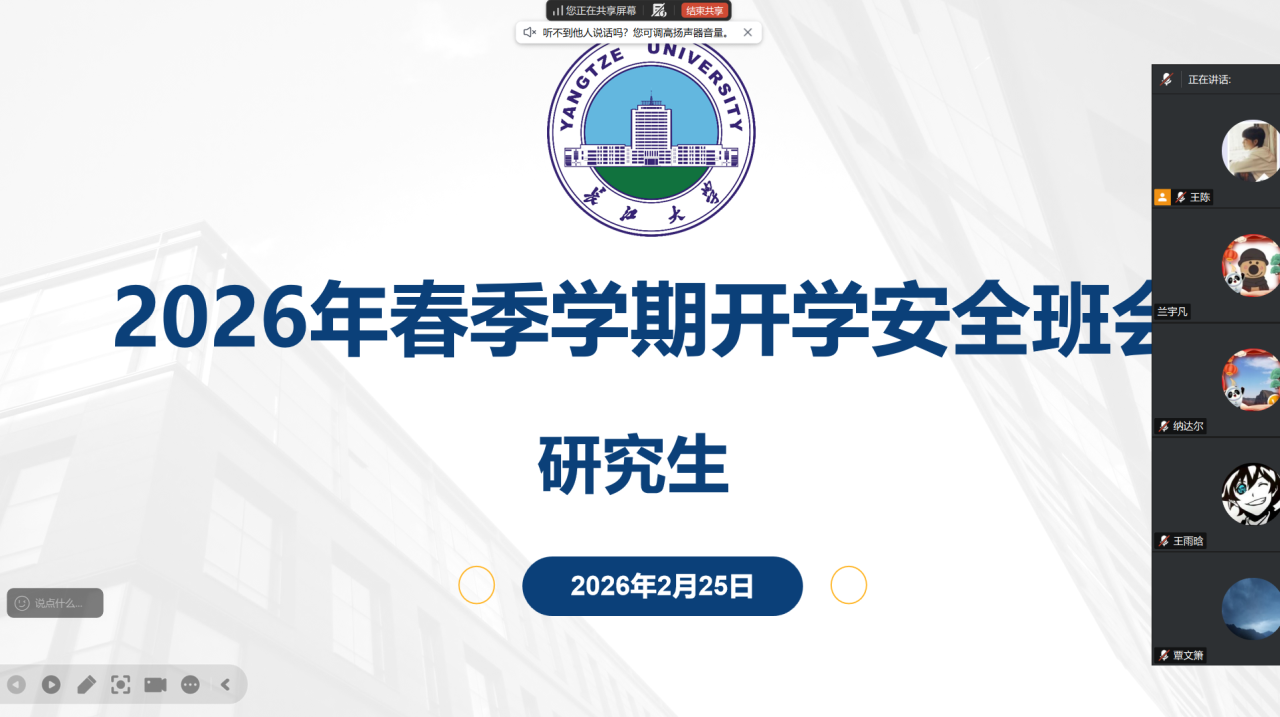 组织本科生、研究生各班级,通过线上会议形式陆续召开2026年春季学期开学主题班会。