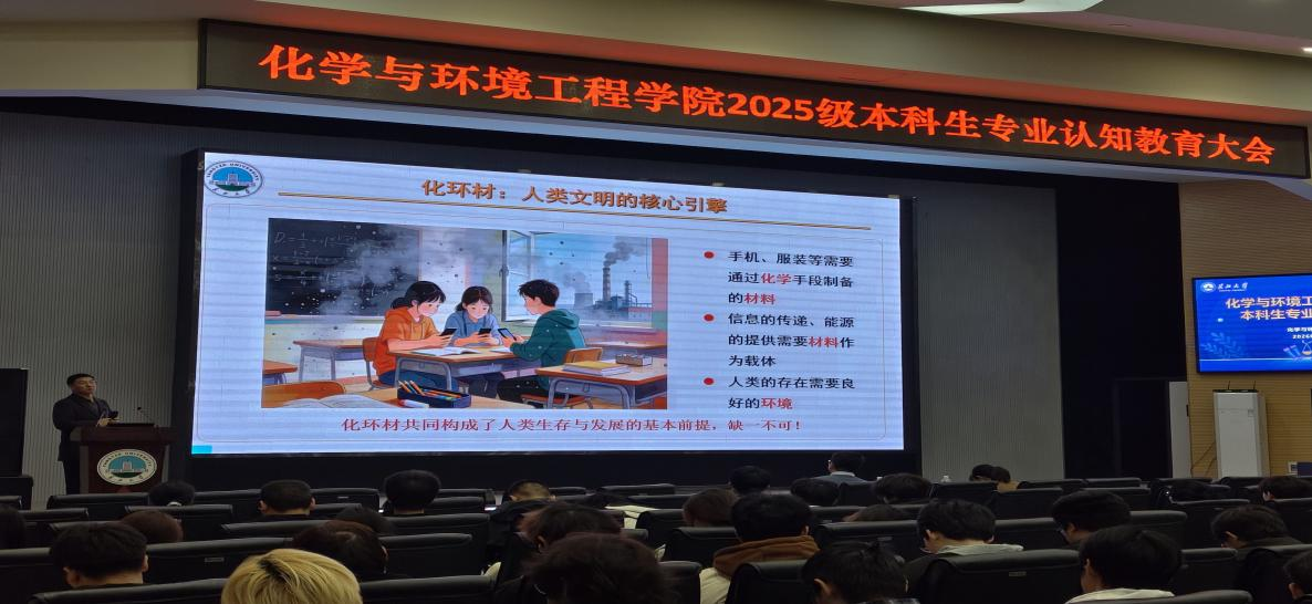 博士生导师米远祝教授担任主讲。米教授以其深厚的学术积淀和丰富的教学经验,围绕“材铸家国底气,化育幸福人生”的主题,为2025级本科生带来了一场精彩的专业认知课。他从“化环材”学科在人类文明进程中的核心引擎作用讲起,生动阐述了化学、材料、环境学科如何构成现代文明的基石,并通过衣食住行、医疗健康、国防科技等多个领域的生动案例,深刻揭示了该学科对国家发展和民族复兴的“硬核底气”。