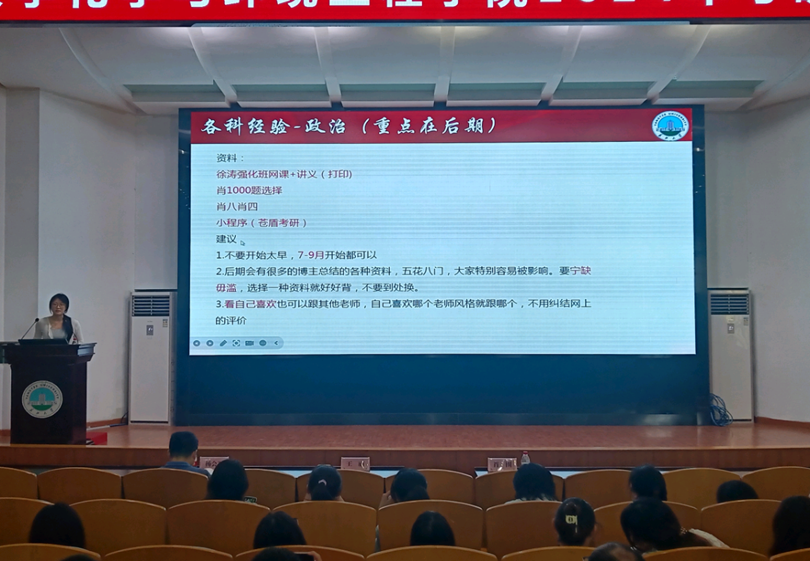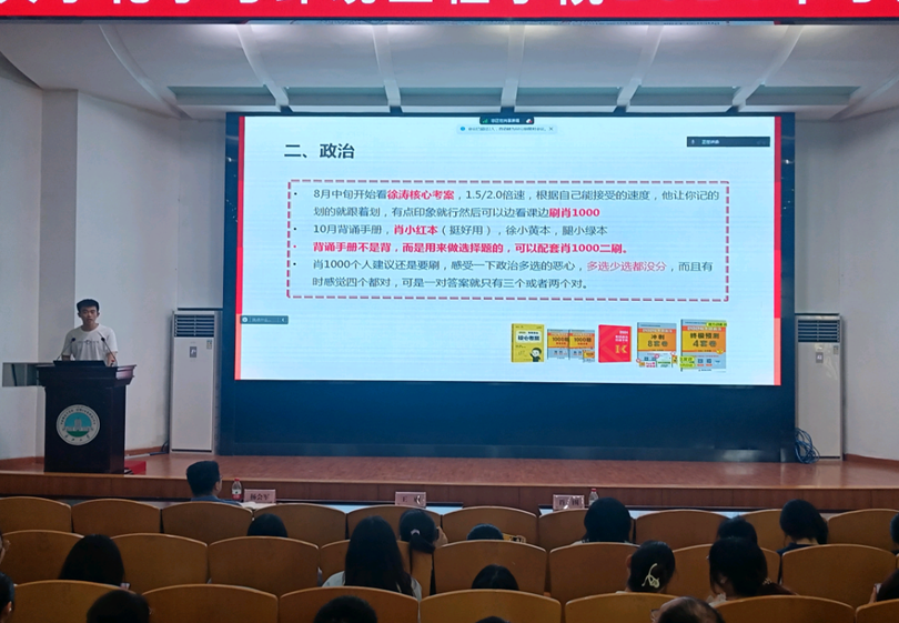 副院长肖围做2025届毕业生考研动员,并讲解2025年研究生报考政策。他就考研报名的注意事项进行了详细讲解,并对同学们提出了殷切希望,鼓励同学们树立适合自己的考研目标,提前规划、尽快行动,并分享了各种收集资料的渠道。