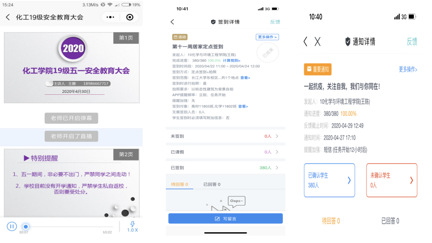 官网、官Q、官微推送疫情居家学习、生活安全提示;还通过辅导猫APP签到摸排学生动向、发布五一安全心理教育资料、收集学生居家生活情况,确保安全教育全覆盖、无遗漏。