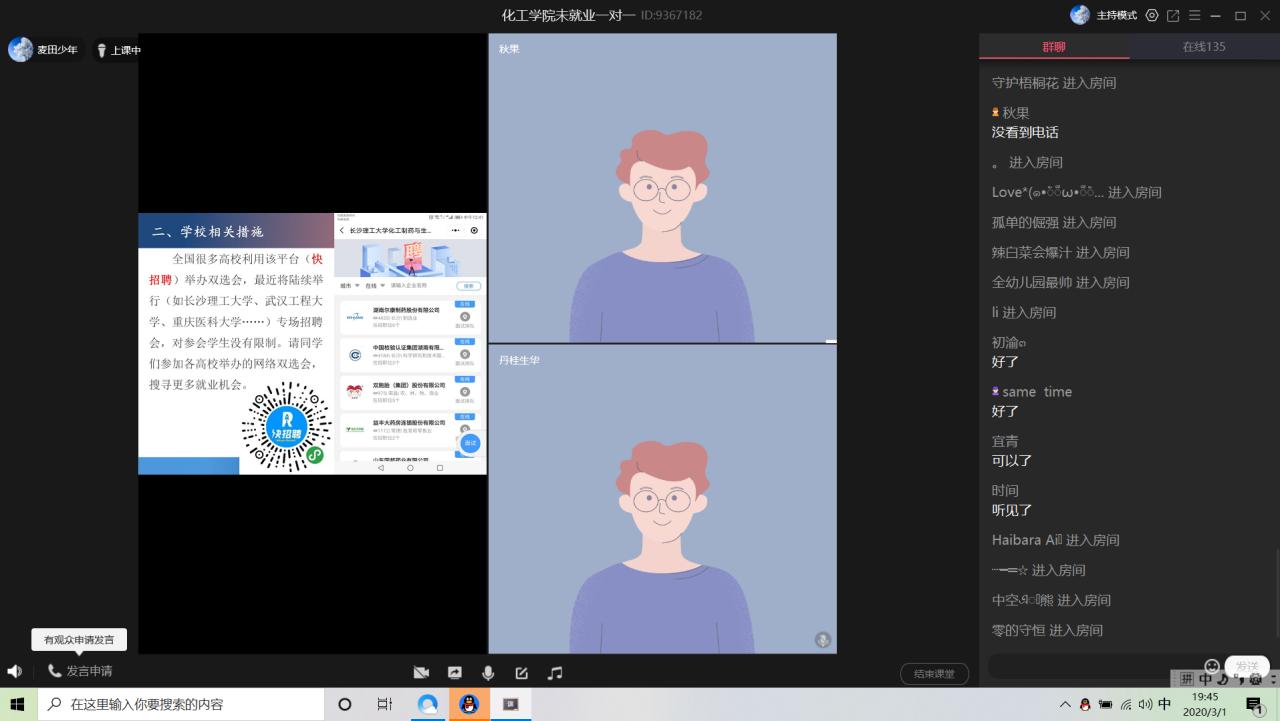 党委书记刘桂生、副书记李秋果、毕业班班主任,毕业生辅导员和2020届未就业毕业生齐聚QQ群课堂召开就业工作推进视频会。会议由16级辅导员杨云锋主持。