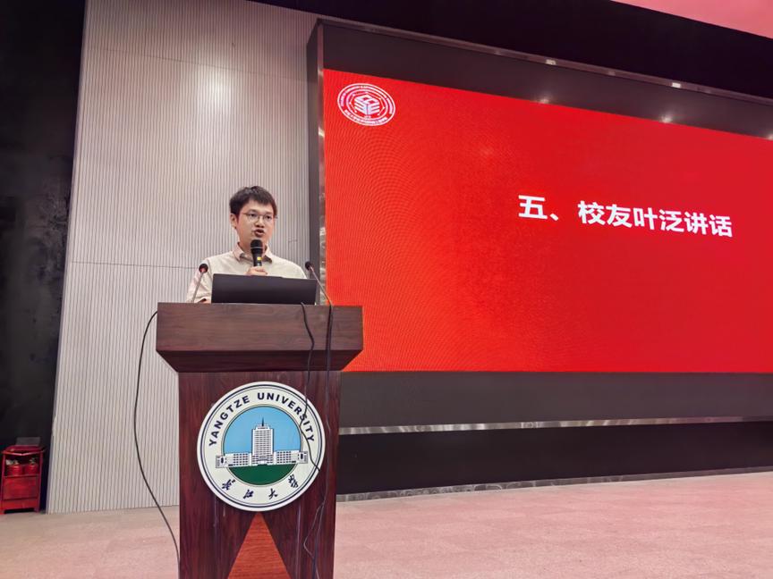 校友代表叶泛向大家分享了自己的成长历程。两年的军旅生活练就了他钢铁般的意志,积极的山区支教也使他品味了人生的意义。他呼吁同学们应当迎难而上,练就不怕吃苦、勇于吃苦的精神,艰难方显勇毅,磨砺始得玉成。心怀热忱,奋起直追。