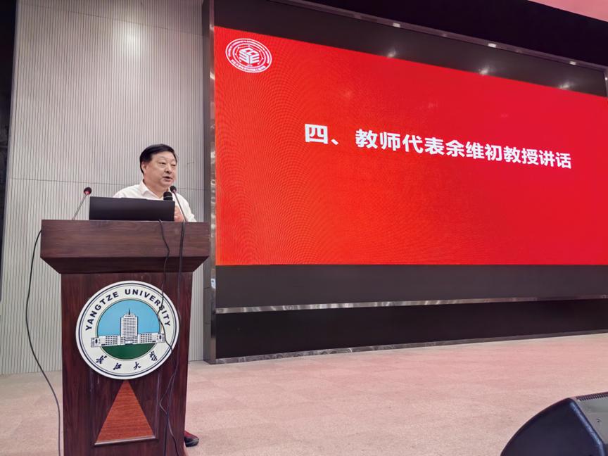 教师代表余维初教授也为新生们指明了未来奋斗的方向。他指出,为学先为人,大学生应当自觉担负起对于国家和社会的责任与使命,努力践行求实进取、创业报国的优良校风。同时也要学会独立,要能够做到个人独立生活,独立思考,拥有独立的人格,活出独立的人生。