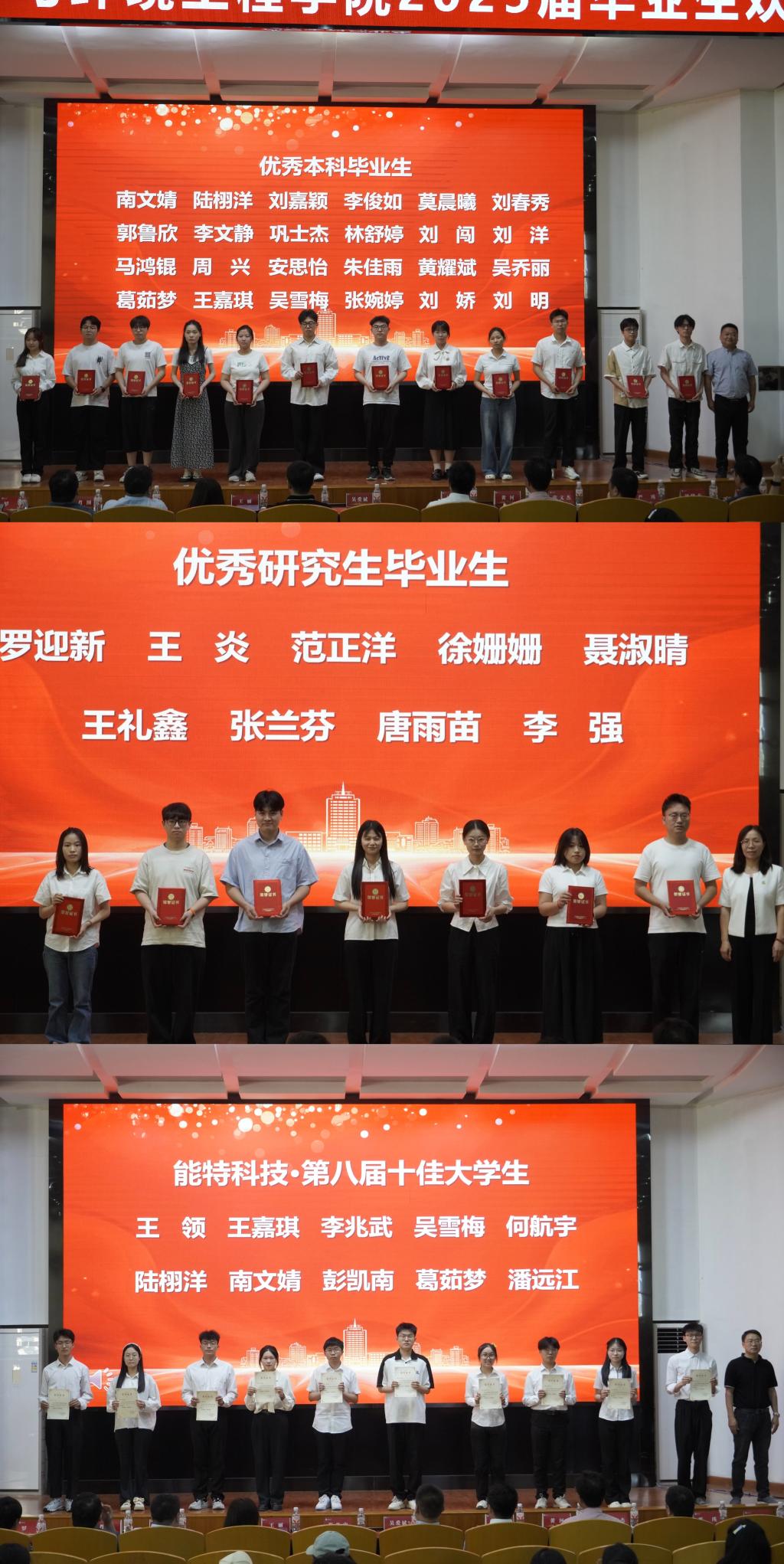 对在学业、科研、实践等领域表现优异的个人与集体进行了表彰。2025届毕业生以笔为刃、以梦为马,共有136名本科生、8名研究生成功考入清华大学、南京大学等高等学府继续深造读硕读博,吴雪梅等21位同学作为考研优秀个人上台领奖;高材12102、化工12101等6个班级以及23栋A404等3个寝室,以卓越的团队协作精神脱颖而出,荣获考研先进班集体和考研优秀寝室荣誉称号;邓智豪、焦珂宣等19位学生,代表2025届57名优秀毕业生上台领奖,他们在校期间努力学习,全面发展,以青春之笔,书写了拼搏奋进的壮丽篇章;最后压轴登台的是荣获凤凰体育