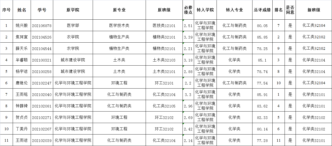 接收计划确定拟接收11名学生转入。现将拟接收学生名单公示如下: