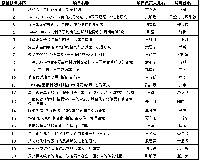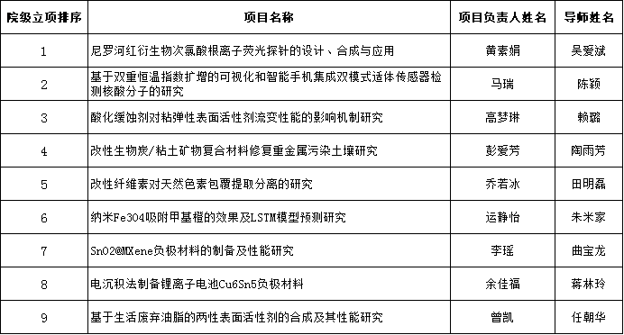 拟推荐《新型人工青口的制备与离子检测》等20项申报校级项目立项,拟立《尼罗河红衍生物次氯酸根离子荧光探针的设计、合成与应用》等9项为院级大创项目,其余1项不予立项,具体名单如下:
