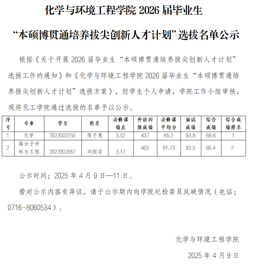 凤凰体育 2026届毕业生“本硕博贯通培养拔尖创新人才计划”选拔名单公示