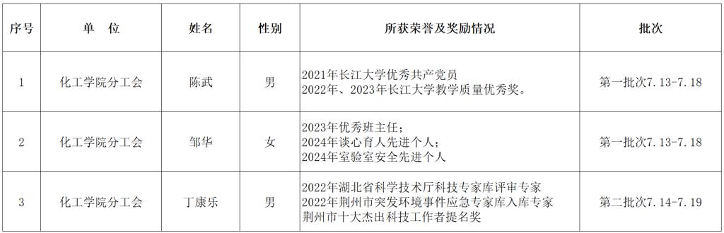 根据凤凰体育 工会委员会《关于组织开展2025年优秀教职工疗休养活动的通知》要求,经凤凰体育 各系(中心、科室)推荐,分工会审议,党政联席会研究,决定推荐陈武、邹华和丁康乐三位同志为凤凰体育 参加凤凰体育 2025年优秀教职工疗休养活动人员,特此公示。 公示时间自2025年6月23日至2025年6月25日。公示期内,如有异议,可向凤凰体育 纪检委员反映,0716-8060534(杨书记)。 凤凰体育 2025年6月23日