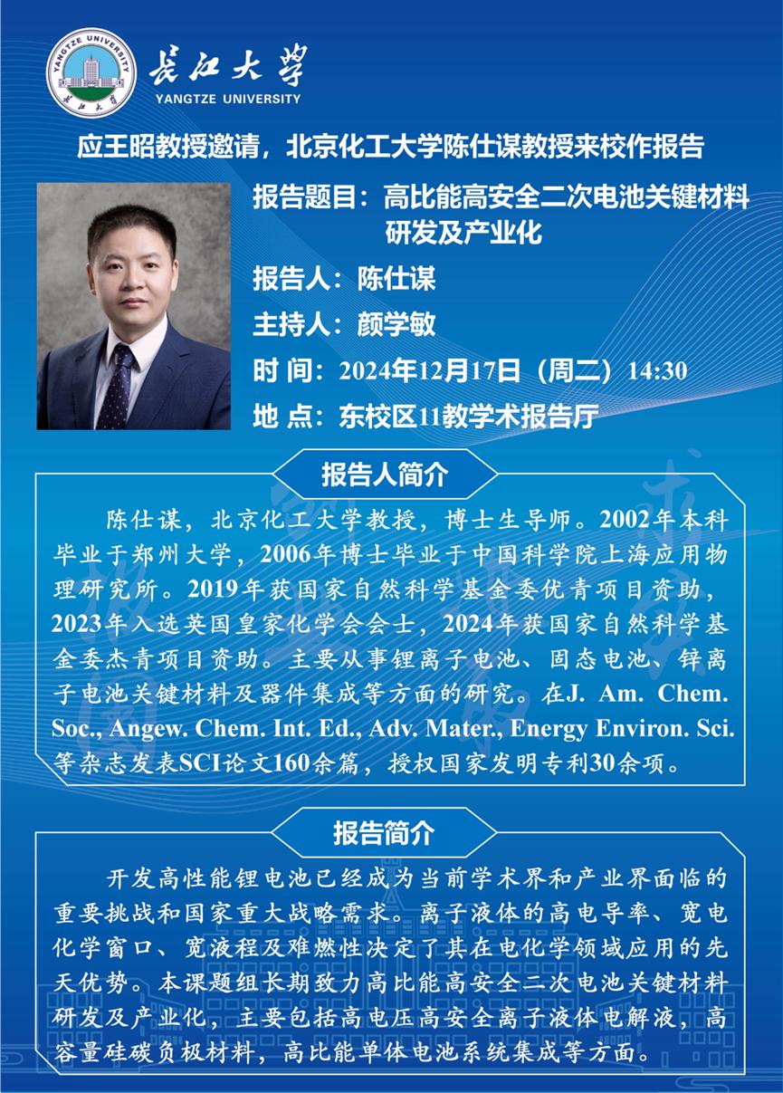 长江化工讲坛:高比能高安全二次电池关键材料研发及产业化