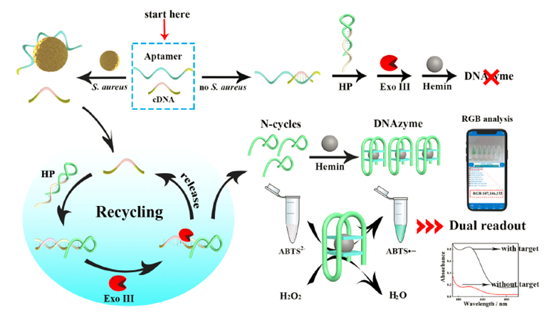 本研究构建了一种基于Exo III辅助循环和DNAzyme的多功能手机集成检测平台,并应用于金黄色葡萄球菌的无损检测。目标物的存在使得发夹型探针释放出大量的富G序列,继而形成DNAzyme模拟过氧化物酶催化底物变色,分别通过光谱仪和手机定量测定。该方法分析性能良好,检出限为32CFU mL−1,线性范围为102至107 CFUmL−1,并且具有复杂样品检测能力。由于以便携普及的智能手机为现场检测工具,通过更换相应的适体和核酸序列,也可实现对其他靶标的现场检测,因此,本策略在食品安全控制方面具有巨大的应用潜力。