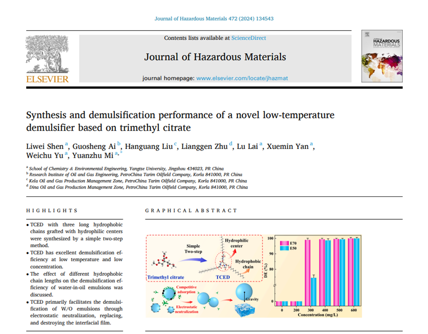 米远祝教授课题组的最新研究成果,报道了一种低温原油破乳剂的制备。论文题目为“Synthesis and demulsification performance of a novel low-temperature demulsifier based on trimethyl citrate”,硕士研究生申利伟为论文第一作者,米远祝教授为论文通讯作者。