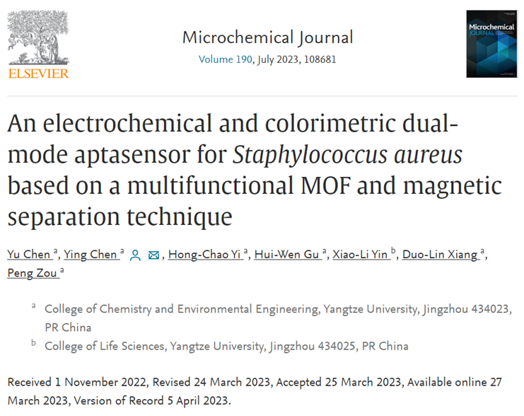 近日,陈颖教授课题组设计合成了一种兼具生物识别、电化学和催化功能的智能核酸功能化金属有机框架复合纳米材料,并将其应用于金黄色葡萄球菌的传感检测研究中。相关研究成果于2023年3月27日以题为“An electrochemical and colorimetric dual-mode aptasensor for Staphylococcus aureus based on a multifunctional MOF and magnetic separation technique”的学术论文发表在分析化学领域国际期刊《Microchemical Journal》上。该文第一作者为凤凰体育