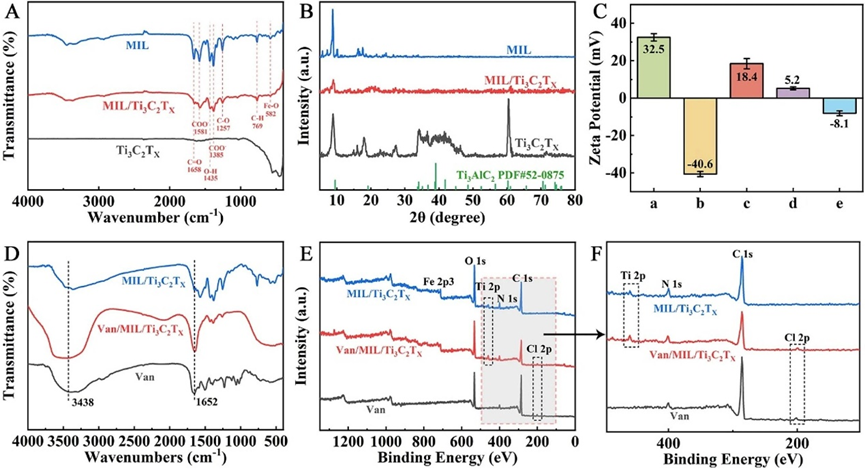 图3. Ti3C2TX、MIL 和 MIL/Ti3C2TX的FTIR、XRD及XPS谱图和Zeta电位