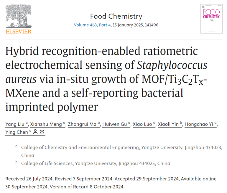 陈颖教授课题组在食源性致病菌的检测方面取得重要研究进展,相关研究成果以题为“Hybrid recognition-enabled ratiometric electrochemical sensing of Staphylococcusaureus via in-situ growth of MOF/Ti3C2TX-MXene and a self-reporting bacterial imprinted polymer”的学术论文发表于食品科学领域国际著名期刊Food Chemistry(IF=8.5,中科院一区Top期刊)上。凤凰体育