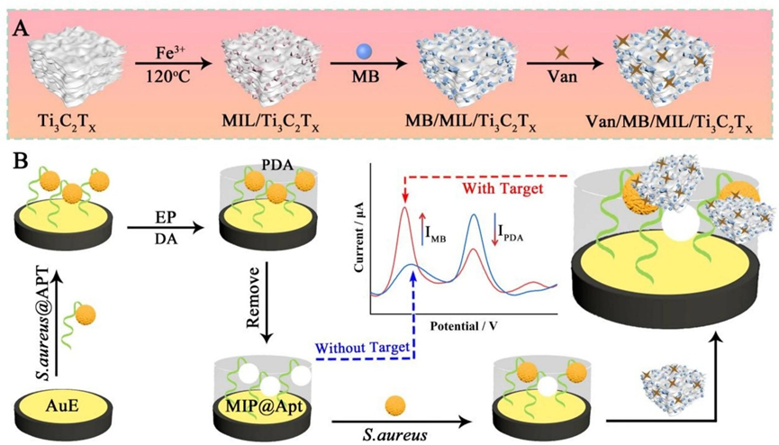 · 本研究结合自报告MIP与原位合成MOF/MXene SP,构建了新型比率电化学传感平台,并首次提出了目标物的三重受体协同识别机制。