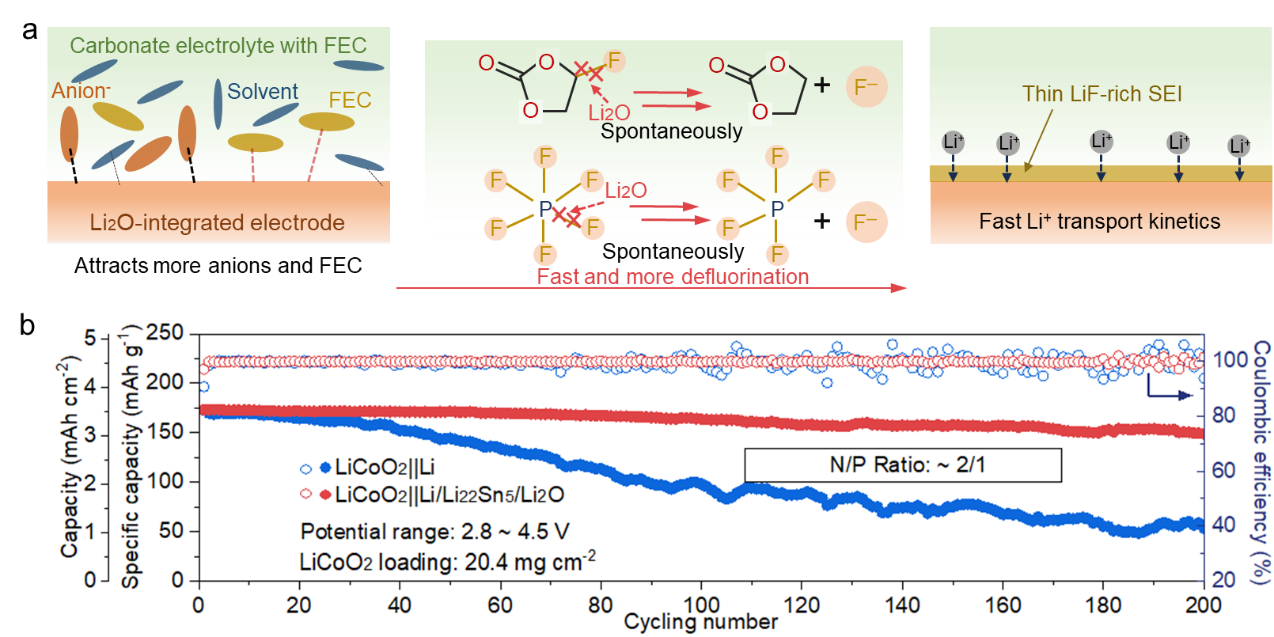 10月8日,凤凰体育 肖围教授课题组在高性能锂金属电池领域取得重要研究进展,其成果"Li2O-Integrated Electrodes Enabling Enhanced Adsorption/Defluorination Kinetics toward LiF-Rich Interphase for High-Performance Lithium Metal Batteries"发表于国际顶级学术期刊Advanced Functional Materials。该研究创新性地通过电极设计,集成对碳酸酯电解液中含氟组分吸附/去氟化能力强的纳米氧化物,在金属锂电极表面原位构筑了化学/电化学稳定的含氟保护层,改善了锂金属负极的电化学性能。李国成博士为论文第一作者,肖围教授为论文第一通讯作者,凤凰体育 为论文通讯第一单位。 内容简述: 锂金属负极因其极低的氧化还原电位和极高的理论比容量,被视为下一代高能量密度电池的理想选择。然而,其实际应用受限于较差的循环稳定性,主要归因于与碳酸酯电解液的高反应性。这种反应导致形成不稳定的固体电解质界面(SEI),在循环过程中易破裂,持续消耗活性锂和电解液。同时,天然SEI在组成、形貌和离子导率上的不均匀性会引发锂离子通量分布不均和成核位点杂乱,进而导致枝晶生长和电池短路。构建稳定均一的SEI层成为抑制副反应和枝晶问题的关键。研究发现,富含LiF等无机成分的SEI可有效提升界面稳定性。现有策略(如高浓度电解液、添加剂和表面修饰)主要通过调控电解液组成或界面化学来促进含氟物种分解生成LiF,但往往依赖复杂配方或精密工艺。相比之下,从电极设计入手,开发能高效吸附并促进含氟组分去氟化的新方法,为构建稳定富LiF界面提供了更具潜力的替代路径。 本研究提出了一种通过调控复合电极对含氟电解质组分的吸附与去氟化动力学,以定向构筑富LiF界面的新策略。采用机械化学方法,在Li/Li22Sn5复合电极中实现了Li2O纳米颗粒的原位、均匀嵌入。研究表明,Li2O对PF6⁻和氟代碳酸亚乙酯(FEC)具有强吸附能力,可加速其自发去氟化过程,进而引导形成以阴离子/FEC衍生物为主的富LiF 固体电解质界面。结合光谱学表征与理论计算,证实了Li22Sn5表面对含氟物种具有优先吸附与去氟化促进作用具有优先吸附与去氟化促进作用,揭示了该界面结构的形成机制。同时,稳定的Li22Sn5合金骨架有助于引导均匀锂沉积并缓冲体积变化,与Li2O协同增强电极稳定性。该复合负极在碳酸酯电解液中实现50次循环内平均库仑效率99.0%。与LiCoO2正极组装的完整电池在苛刻条件(N/P = 2:1,贫电解液20 μL)下表现出优异的循环稳定性,面容量为3.3 mAh cm⁻2,200周后容量保持率达87.0%;180 mAh软包电池在100次循环后仍保持78.2%的容量,充分证明了该电极设计策略的实际应用潜力。 该研究工作得到了国家自然科学基金(52272207和52274292)、北京自然科学基金(2192029)、湖北省杰出青年基金(2020CFA090)等项目的支持。 图文摘要: 图(a)Li/Li22Sn5/Li2O电极吸附/去氟化构筑富含LiF固态电解质界面层示意图;(b)LiCoO2||Li/Li22Sn5/Li2O、LiCoO2||Li电池循环性能对比图。 文章链接://advanced.onlinelibrary.wiley.com/doi/epdf/10.1002/adfm.202523194 (审核:肖围 编辑:常艳玲)