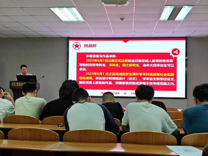 团委书记周学素老师介绍了“挑战杯”竞赛的历史背景、近几年参赛情况、参赛要求、评审标准以及往年的优秀获奖作品,并结合往届优秀案例,分享了参赛经验。在互动环节,同学们积极提问,周学素老师为同学们提供了宝贵的建议和指导。